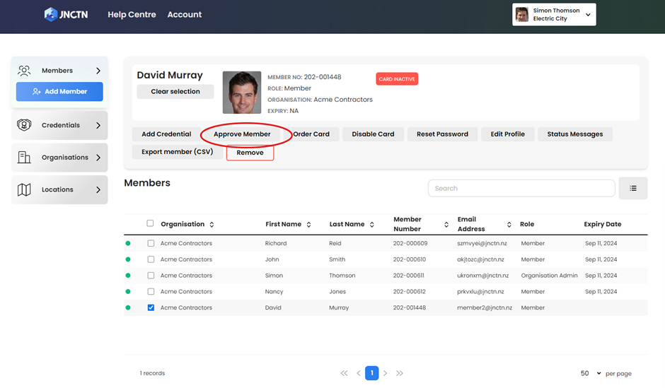 Any new members that have associated themselves with your organisation when registering will require your approval to complete their registration. Until you do this their card will not be active and they will not appear as working for your organisation